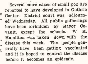 A hundred years ago, smallpox was a growing concern in Guthrie County, Iowa. The clippings are from The Stuart Herald, February 17, 1922.